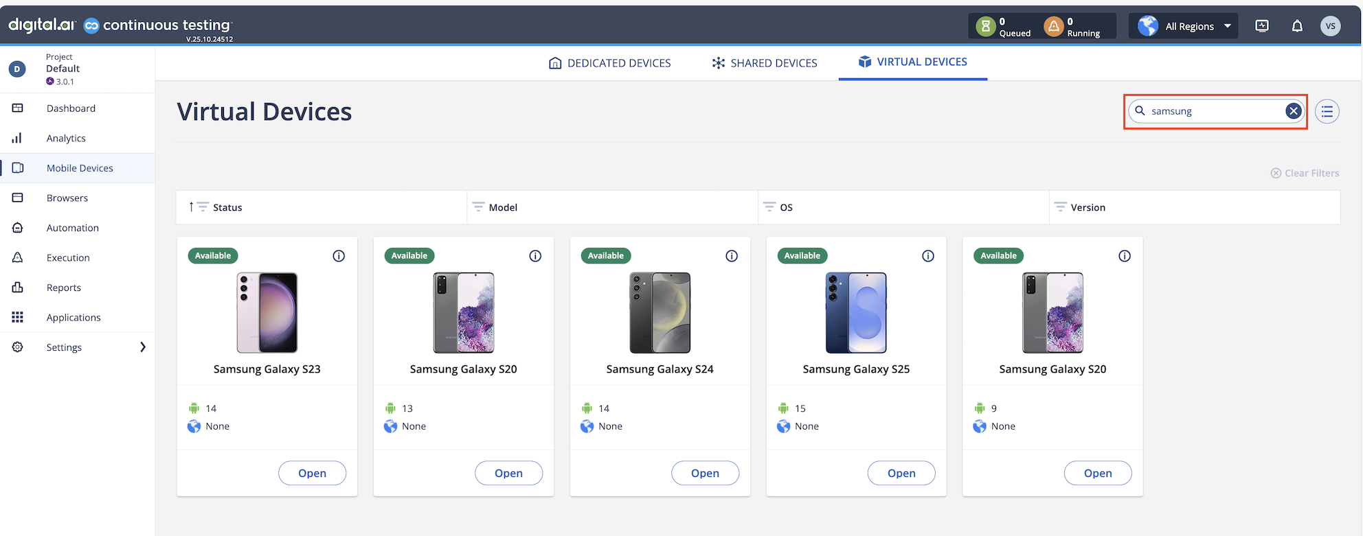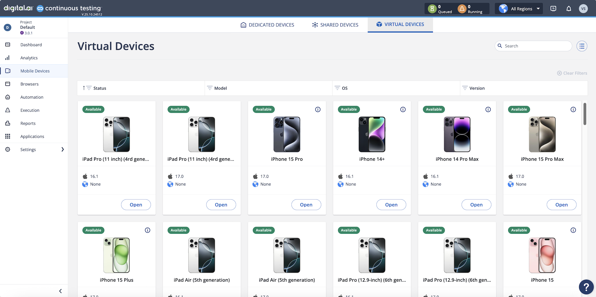 To get started with Live Virtual Mobile Devices Testing, navigate to the Mobile Devices page and switch to the Virtual Devices tab, to find all available virtual devices for both iOS and Android: