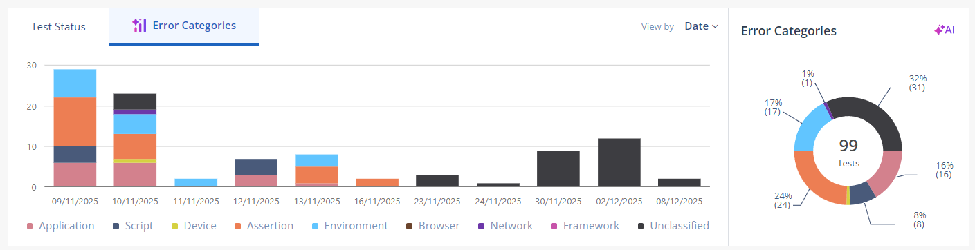 On the Tests page, click on the Error Categories tab to access visual analytics.