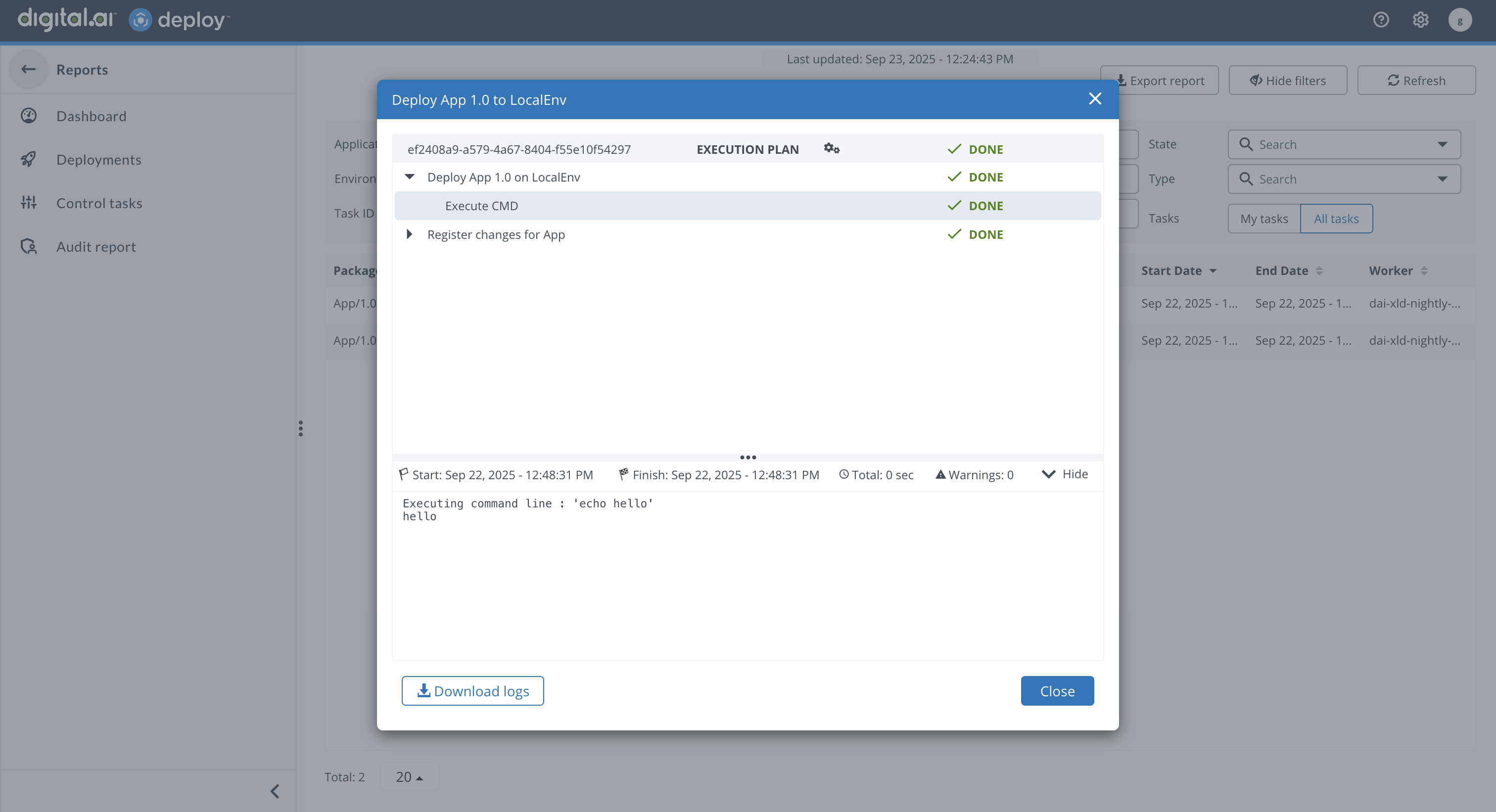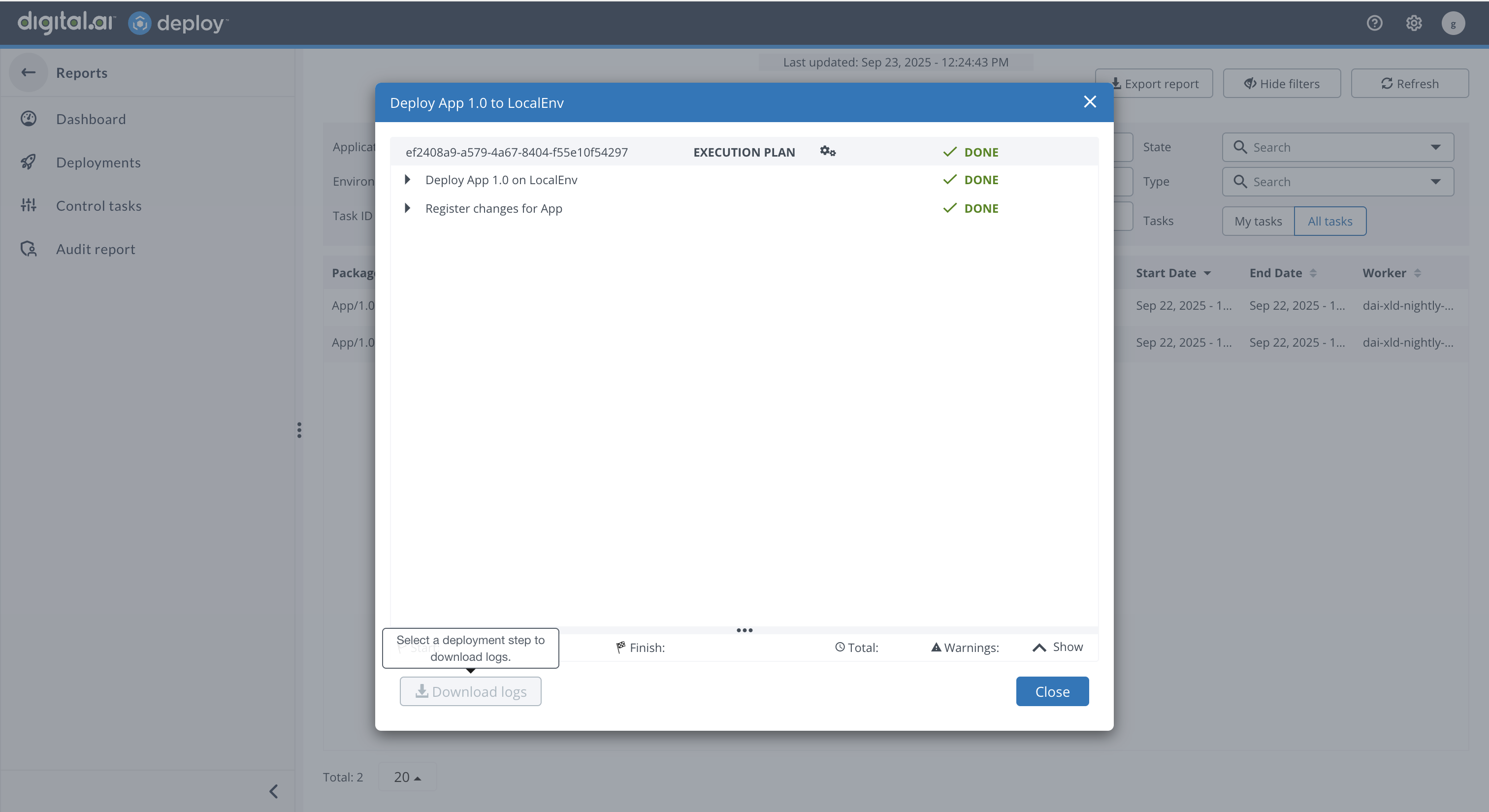 You can download logs for an individual deployment step directly from the step preview window in the Reports section, without exporting the full deployment log.