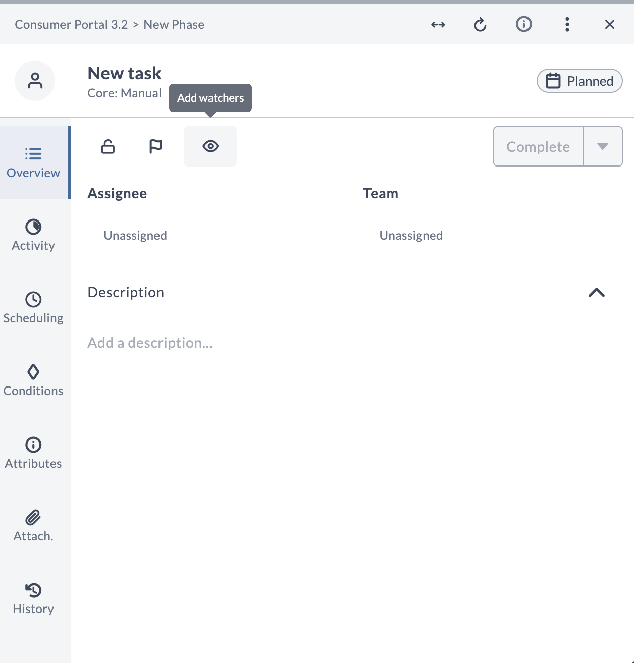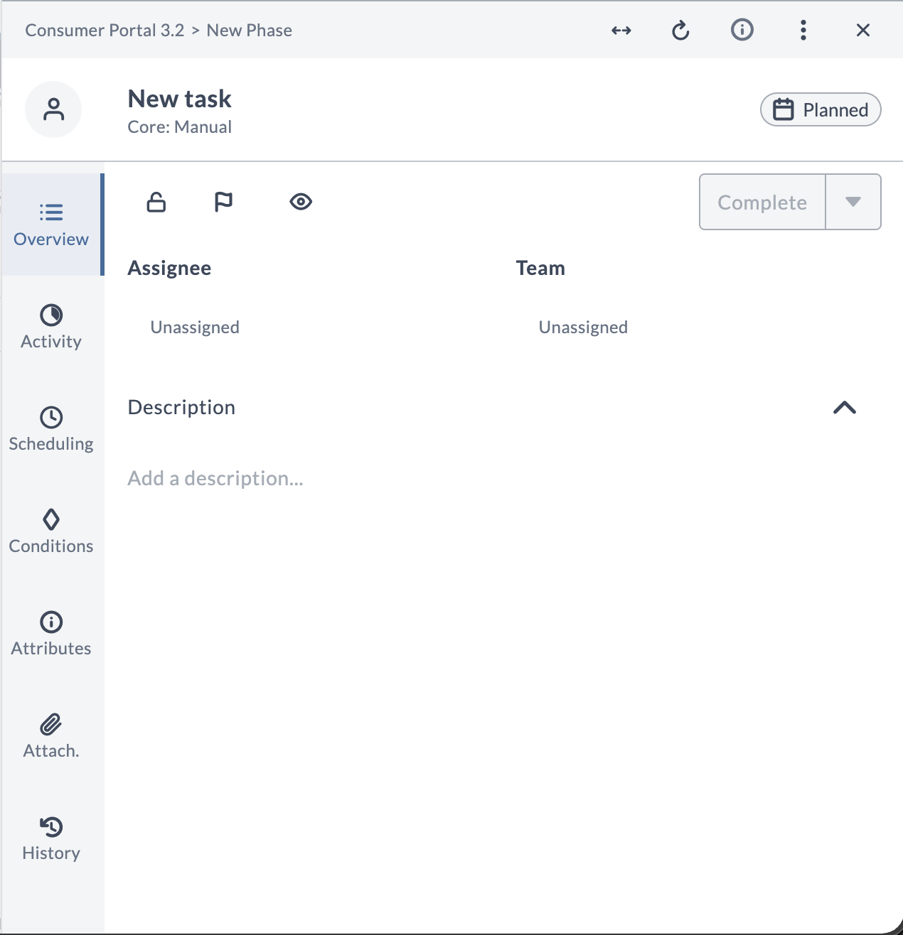 The Overview tab displays the Assignee and Team fields at the top, followed by the Description section. The left sidebar provides navigation to other tabs such as Activity, Scheduling, Conditions, Attributes, Attachments, and History.