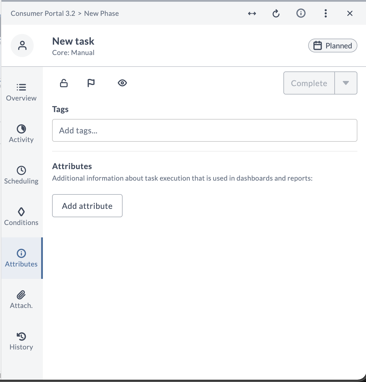 The task title appears at the top of the task drawer. To change the title, click it. The task type (for example, "Core: Manual") is displayed below the title.