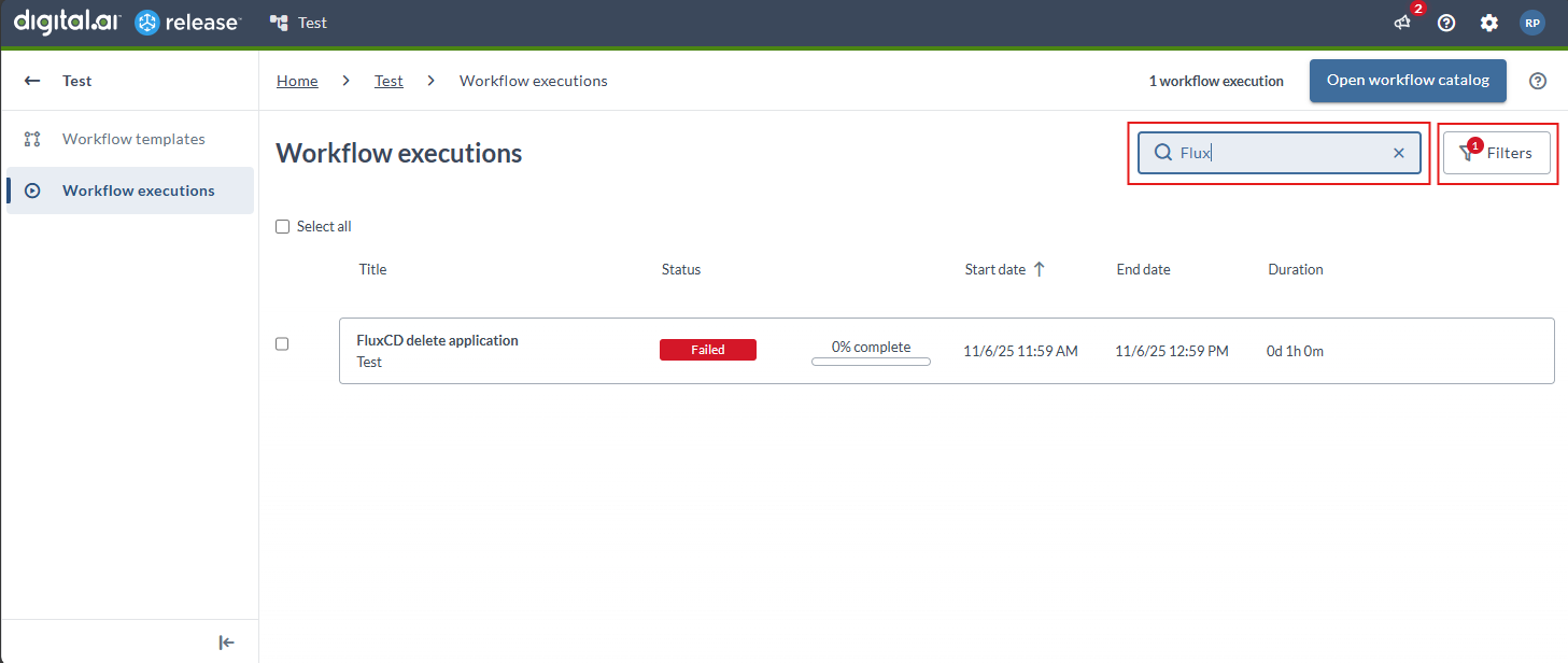 The existing workflows bundled with Release and the newly created workflows are available in the Workflow catalog page. To run your workflows, you must navigate to the Workflow catalog page. For more information, see Access Workflow Catalog.